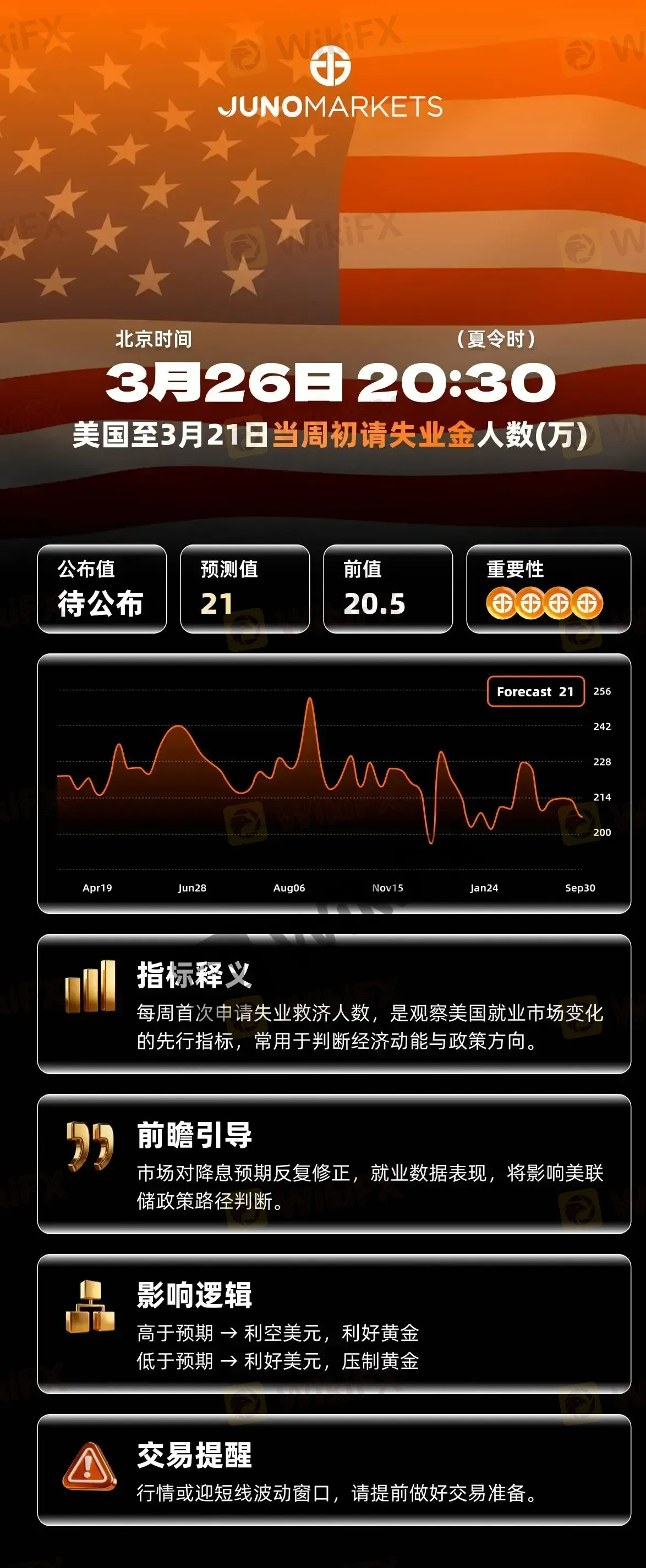 摘要:⏰ 时间:3月26日 20:30(北京时间)📊 指标:美国初请失业金人数🔢 前值:20.5万人🎯 预期:21万人📌 为什么关注这个数据?初请失业金人数是每周公布的就业市场“风向标”,反映企业裁员力度和就业市场的真实温度。数据波动会直接影响美元、黄金、美股的短期走势。📈 今晚怎么看?若公布值 21万就业市场比预期更强 → 利好美元,利空黄金若公布值 21万就业出现松动迹象 → 利空美元