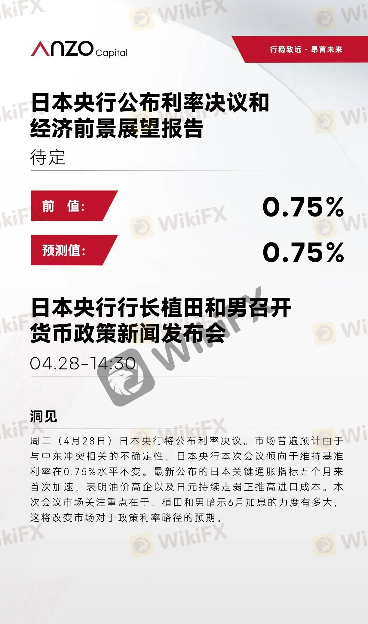 摘要:【北京时间·2026年04月27日】日本央行利率决议。 周二(4月28日)日本央行将公布利率决议。市场普遍预计由于与中东冲突相关的不确定性,日本央行本次会议倾向于维持基准利率在0.75%水平不变。最新公布的日本关键通胀指标五个月来首次加速,表明油价高企以及日元持续走弱正推高进口成本。本次会议市场关注重点在于,植田和男暗示6月加息的力度有多大,这将改变市场对于政策利率路径的预期。