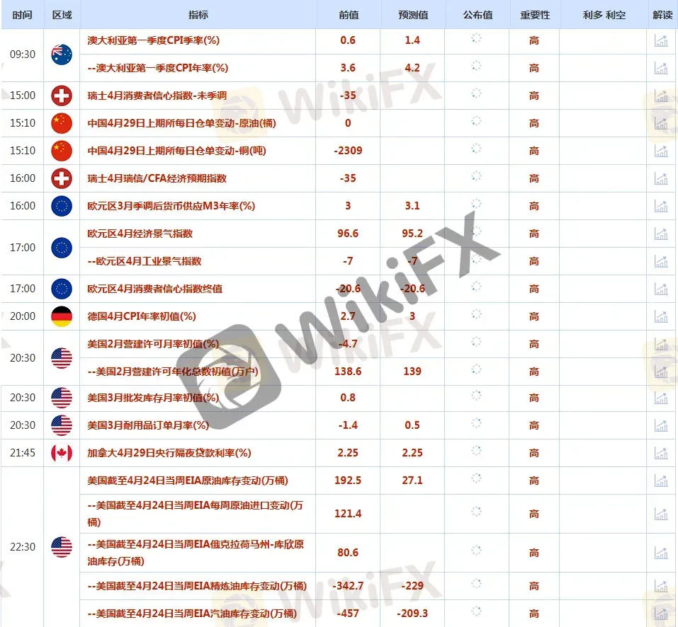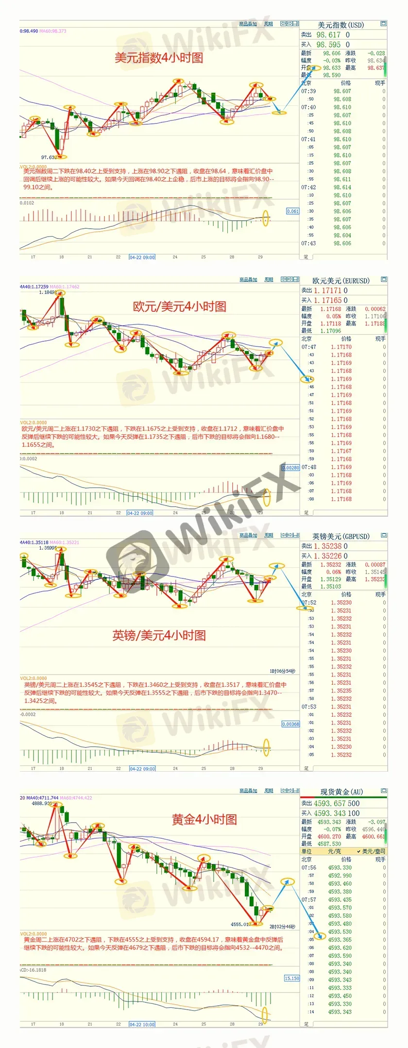 摘要:CWG Markets市场资讯2026年4月29日(周三)汇讯摘要:周二,美元指数先涨后跌,盘中一度逼近99关口,随后回吐部分涨幅,最终收涨0.16%,报98.63;基准的10年期美债收益率收报4.353%,对美联储政策利率敏感的2年期美债收益率则收报3.850%。北京时间4月29日亚市早盘,现货黄金交投于4593美元/盎司附近,金价周二回落近2%,一度跌至四周最低至4554.91美元/盎司,日内