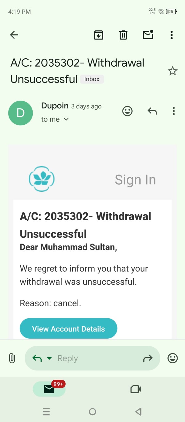 喺DuPoin遇到提款問題,令我感到極度憤怒同無助。呢啲係我投資同辛苦賺返嚟嘅資金,但當我嘗試提款時,佢哋就被拖延、卡住,從來冇畀過一個清晰嘅解釋。感覺就好似被困住咁——明明知道錢喺我嘅賬戶入面,但就冇辦法移動佢。最令我失望嘅係,存款過程順暢又容易,但提款就變成最大嘅障礙。呢件事令我嚴重質疑平台嘅誠信同安全性。對我嚟講,呢個已經唔單止係技術問題——感覺就好似被欺騙同背叛咁。