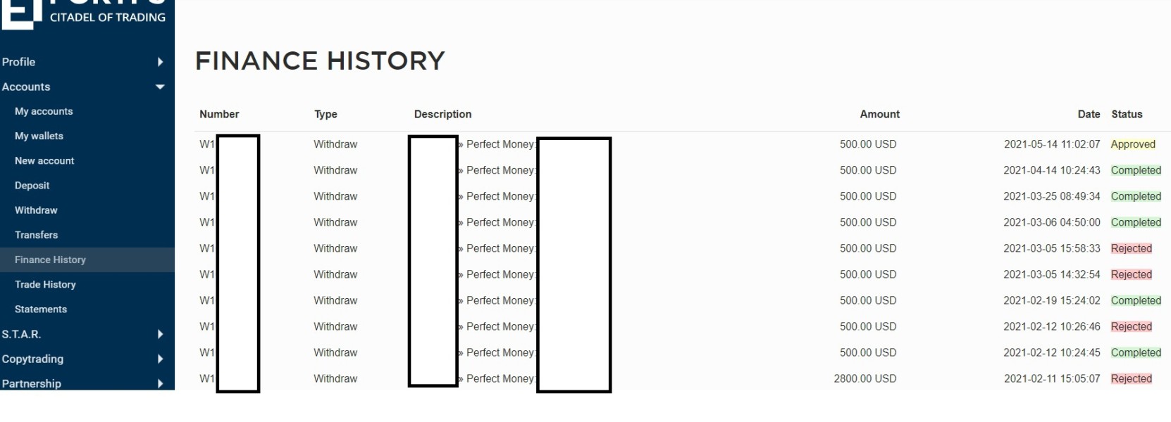I have no open trades, requested to withdraw about 3000 usd, was told that maximum is 500 usd and only trough PerfectMoney.