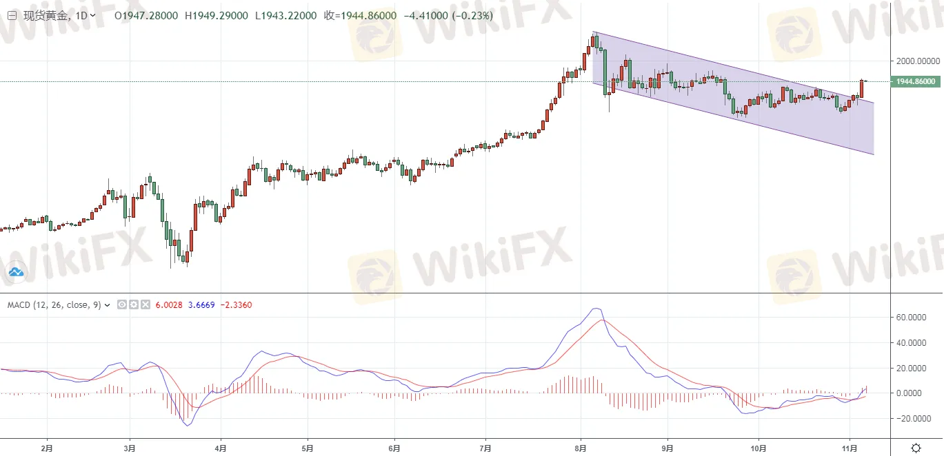 現貨黃金昨日收報1948.71美元/盎司,上漲45.80美元或2.41%,盤中觸及9月21日以來的高點1952.68美元/盎司,最低觸及1902.39美元/盎司。今天現貨黃金有些許的回落,仍位於1940關口上方,暫報1944.86美元/盎司。從近期的表現看,金價整體呈現出高位回落的格局,從趨勢看,金價反彈高點不斷被壓低,由於市場對於目前已知的風險已經麻木,致使黃金連續承壓回落。但是伴隨著歐美疫情的進一步加劇,美國大選的不確定性等均使得市場避險情緒回升,金價在不確定性的緊張氛圍中一柱擎天直接站上1940關口,並且下方的MACD指標也顯示做多動能在逐步增強,短線仍有望進一步走強。(僅供參考)