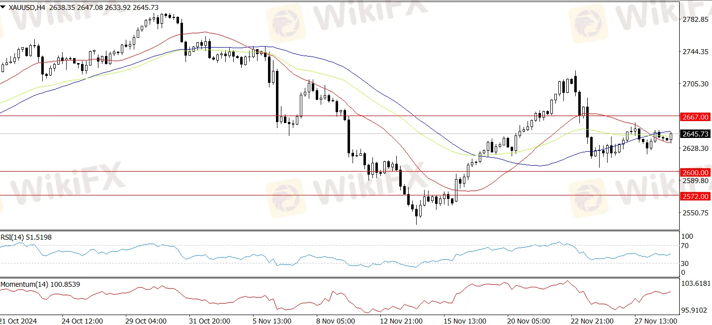 摘要:產品:XAU/USD預測:上升基本分析:週五早間(11月29日),現貨黃金價格從日低2633.85美元/盎司迅速反彈,最高觸及2645.52美元。由於地緣政治緊張局勢以及對美聯儲可能降息的猜測,黃金價格仍維持在2600美元/盎司上方。以色列和黎巴嫩已達成為期60天的停火協議,但俄羅斯與烏克蘭衝突的升級可能會支撐金價繼續維持在2600美元上方。週四,俄羅斯總統普京表示,對烏克蘭的大規模攻擊是為了回應