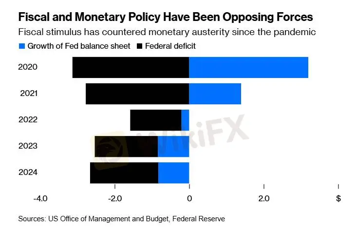 自從聯準會開始對抗通膨以來,美國財政和貨幣政策出現了巨大分歧。聯準會試圖透過提高短期利率來減緩經濟成長,從2022年開始,在短短一年多的時間裡,短期利率提高了5個百分點以上,這是50年來最大幅度的升息,直到去年秋天才略有回落。自升息行動開始以來,聯準會將其資產負債表縮減了超過2兆美元,約佔其原始規模的四分之一。