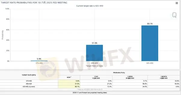 本周即將迎來備受關注的美聯儲利率決議。根據CME FedWatch工具顯示,期貨市場認為本次會議降息的概率幾近於零,對6月17–18日會議降息的預期也已降至僅約31%。這一轉變主要受到上周公佈的強勁非農就業報告以及本周ISM服務業資料持續反映經濟韌性所推動,短期內削弱了市場對寬鬆政策的押注。