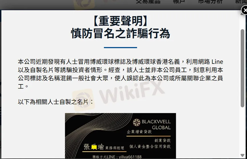 最近知名券商Blackwell Global博威環球在官網發布重要聲明,提醒所有投資人慎防冒名之詐騙行為。據了解,有人利用社交軟體LINE並自製假名片勸誘投資,但經查證後確認是利用Blackwell Global博威環球LOGO與名稱的仿冒者,請大家千萬別上當。