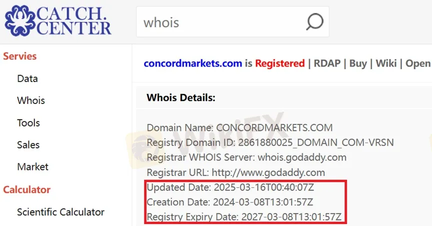 進一步使用CATCHCENTER查詢Concord Markets網站,可以看到其設立時間是2024/3/8,並且在2025/3/16才更新過,至今只有2個多月,時間相當短暫,而網站預計在2027/3/8註冊到期,也只剩下1年多,不確定是否有長期經營的打算,這種情況值得留意,建議投資人優先使用其他更安全的交易平台。