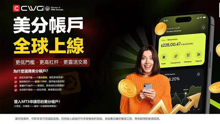 無論是交易新手還是資深投資者,CWG美分帳戶的上線都為全球用戶帶來了更多的機會。 ,您可以享受更低的門檻,更高的杠杆,以及更加靈活的交易體驗。 通過MT5平臺,隨時隨地查看您的交易狀況,讓每一分投入都更具價值。