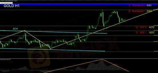 不過挑戰前高失敗,黃金於4353壓力位(Resistance1)停滯不前,隨即反轉向下回測支撐。觀察MACD擺蕩是指標,柱體由正轉負,顯示當前分析以震盪或走跌概率較高,交易面應保持中性觀望。