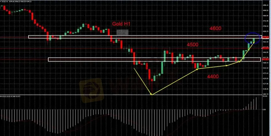從H1K線圖來看,金價在3月23日經歷了劇烈的下探,最低觸及約4130附近,隨後展開強勁的V型反轉。目前金價已連續突破4400與4500兩大整數關口,並在3月25日淩晨衝擊4600壓力位。MACD指標顯示,柱狀體已由負轉正並持續放大,快慢線在零軸下方金叉後大幅上行,顯示多頭動能正處於強勢噴發階段。