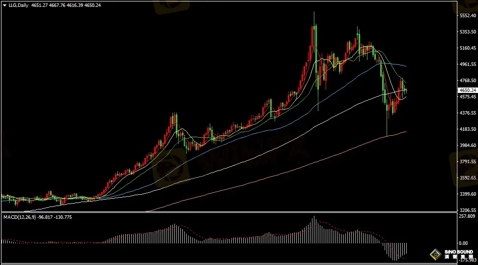 金價日線圖看,昨日金價維持震盪走勢,金價最高觸及4700美元附近回落,最低至4600美元關口獲得短線支撐。日線指標看,5日均線向上突破100日均線,金價在100日均線附近震盪整理;MACD指標負動能柱逐步減少,RSI指標在45位置附近走平。